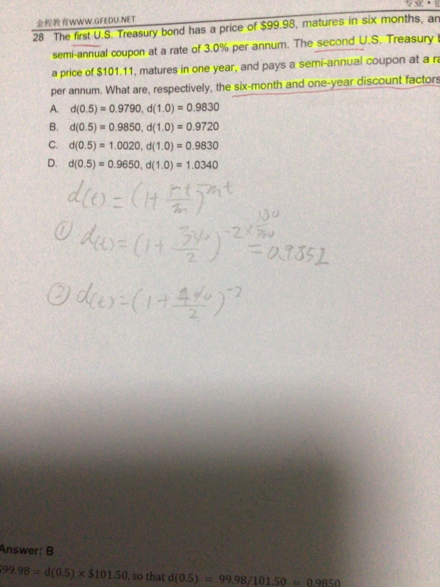 同学你好,如果是用公式的话,就是像你说的那样啊,带入d(t)=(1+r(t)/m)^-mt,题目会说明r(t),m,t,直接套公式就可以算出折现因子了