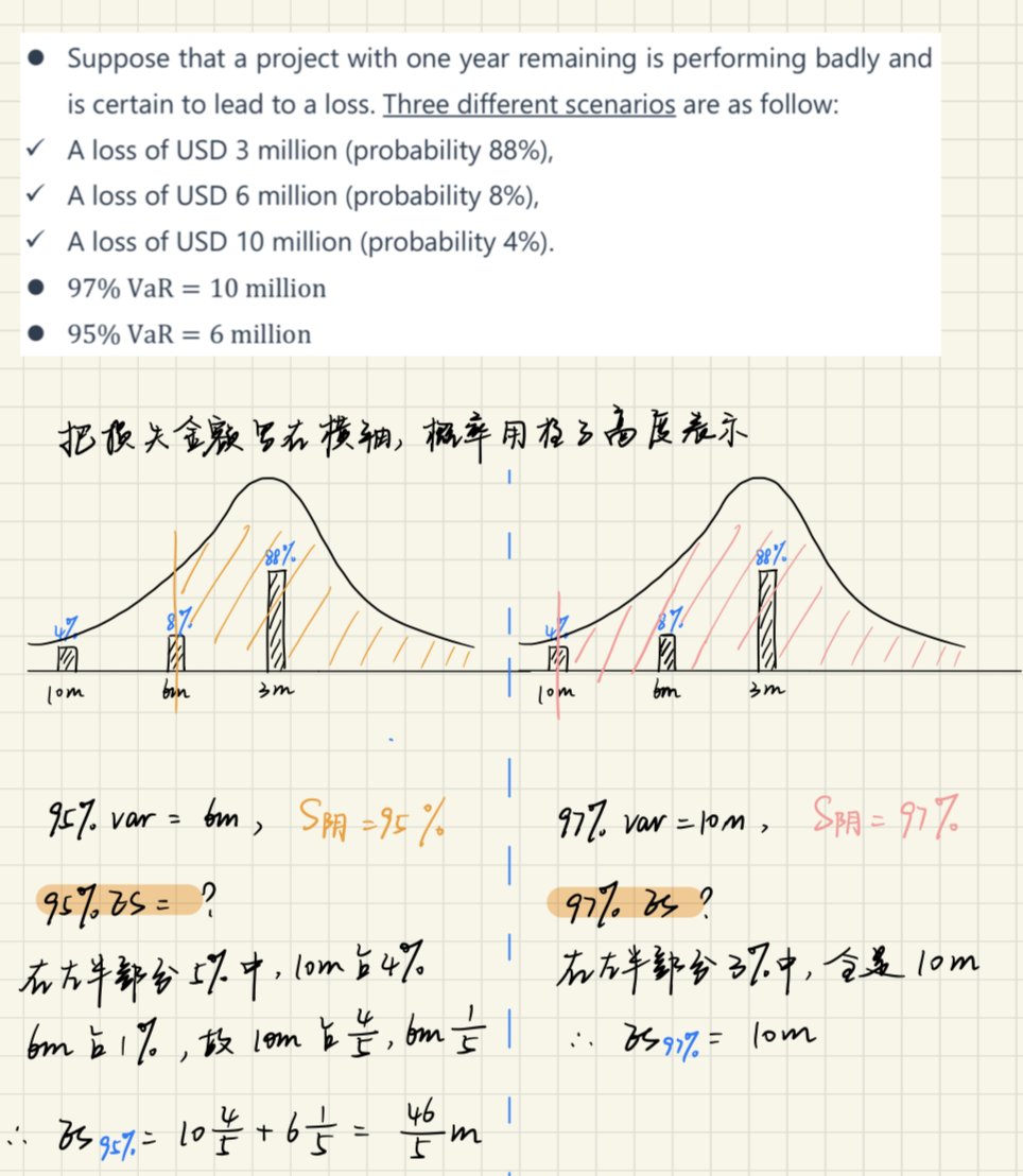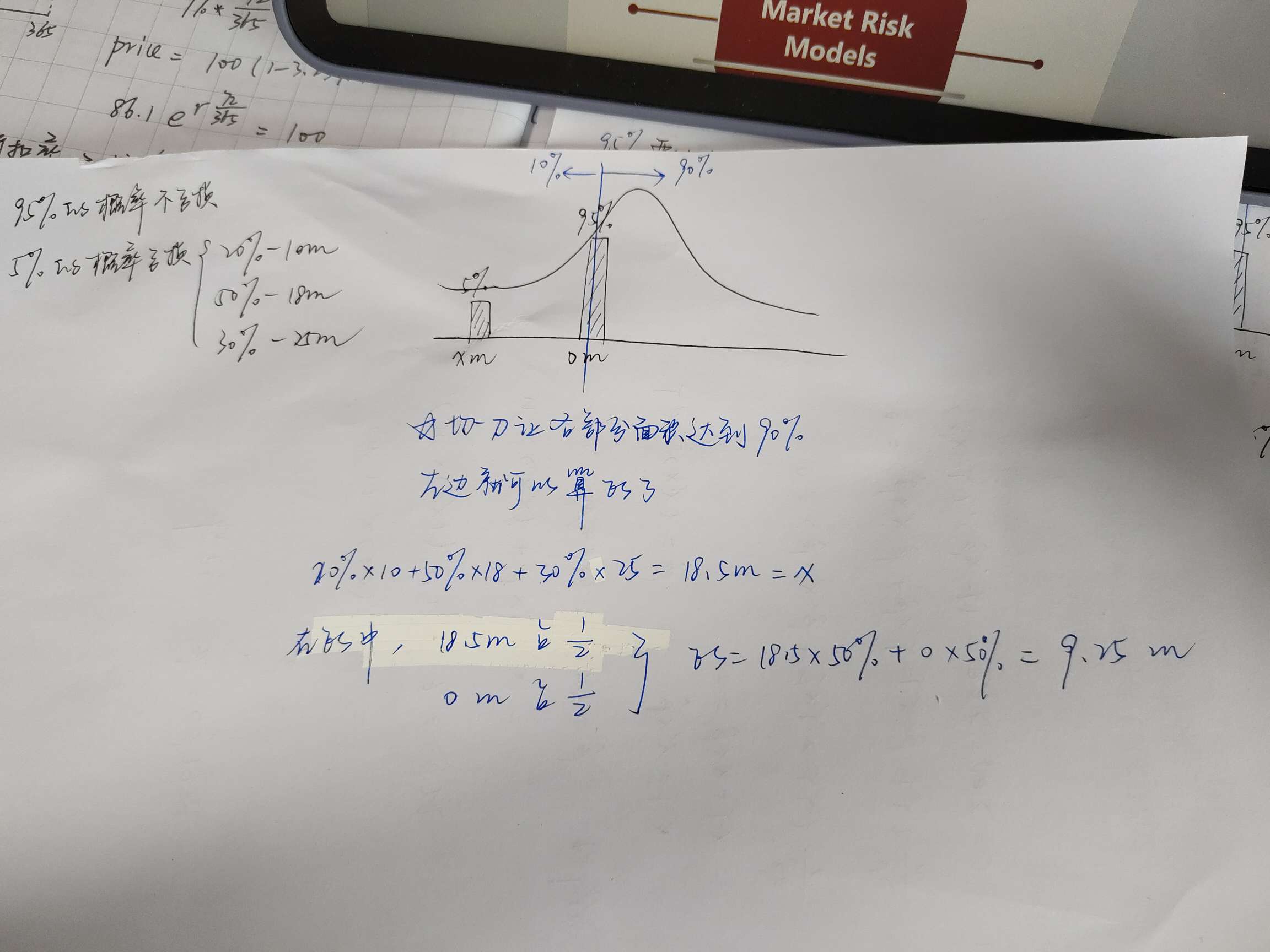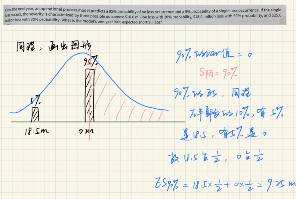 同学我这样说你看理不理解,90%的var值是指把所有你能看到的损失概率全都加总,加到90%的时候切一刀,切出来多少损失var值就是多少。也就是说在95%这根柱子上要切成两部分,一部分是5%,一部分是90%,所以这道题90%的var值其实是0。(如果问你98%的var值,你就要继续向左累计,在5%的柱子上切一刀,即18.5。)但题目问的是ES,按照图片里的公式就可以算啦。我说的可能有点绕,可以等助教老师继续为你解答~