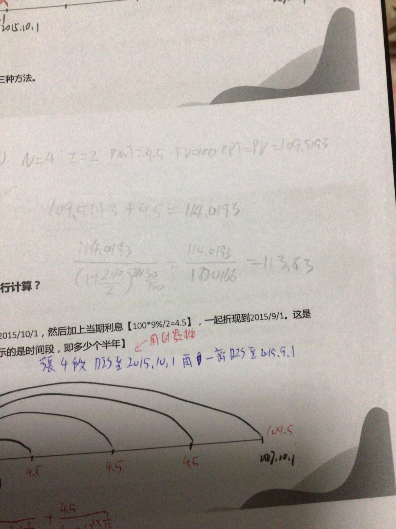 如果我们站在2015.9.1来看,此时的债券全价是:10.1的现金流、2016.4.1的现金流、2016.10.1的现金流......2017.10.1的现金流。这些现金流分别贴现到2015.9.1。