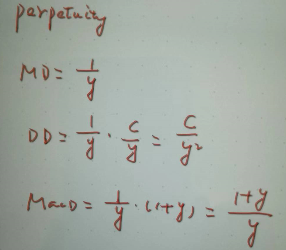 同学你好,不管是半年利一次,还是按照季度复利,永续债券的价格都是c/y,用这个式子关于y求导,得出的就是DD,再将DD除以债券价格,得到的就是MD,所以DD和MD没有变化