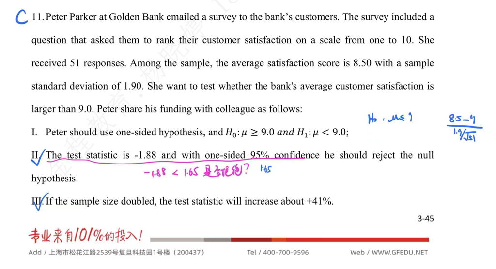 那老师您看这道题 密卷第11题 第二条描述检验值是负数,关键值是正数的1.65,单尾检验,理论上不应该拒绝啊,为啥会拒绝呢?请解释下,谢谢
