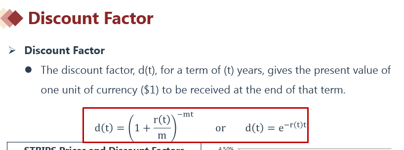折现因子(Discount Factor),表示未来的1块钱今天值多少钱。表达式为d(t),比如d(0.5)=0.97557,表示0.5年后的1块钱今天值0.97557元,折现因子可以直接给债券定价。比如现在有债券A,3个月后要支付105元,那么债券A现在的价值为105×三个月期的折现因子。