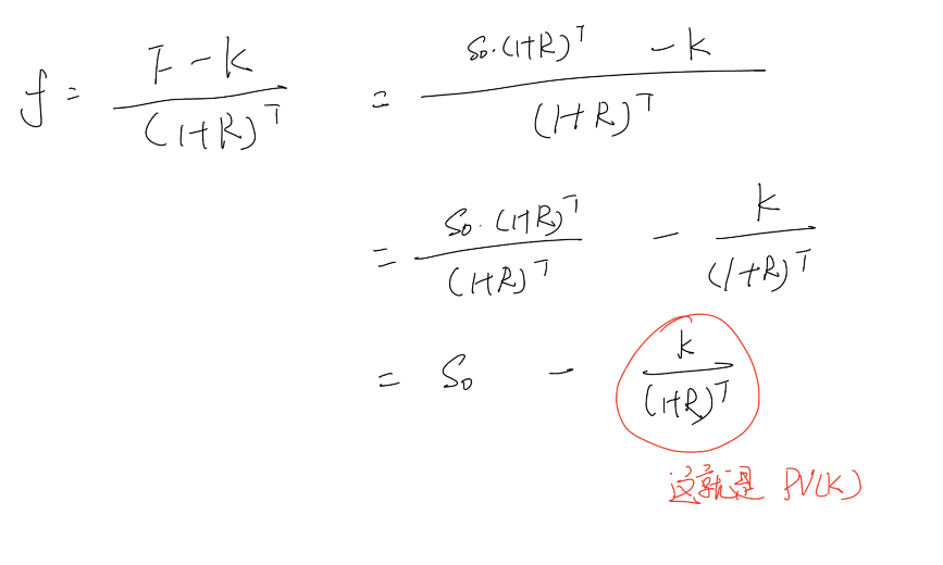 这个时候,如果F_0高于期初约定的价格K,证明合约远期价格上升,多头方赚钱,此合约给投资者带来的价值就是F_0-K,但是F_0-K的好处最终是T时刻实现的,并不是0时刻实现的,所以,投资者虽然可以根据二者之间的差额确认给投资者带来的好处,但是这个好处是要T时刻才能够成立的,如果投资者要算这个好处现在值多少钱,投资者还要把它折现到0时刻,即(F_0-K)折现,这就是远期合约的价值。