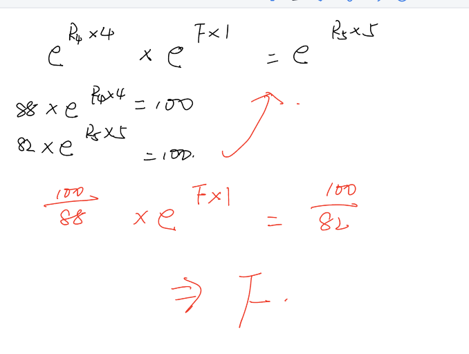 100*d(4)=88,所以d(4)=0.88,又因为这里假定的是连续复利,所以d(4)=1/[e^R*4]=0.88,求出R,然后去计算远期利率。