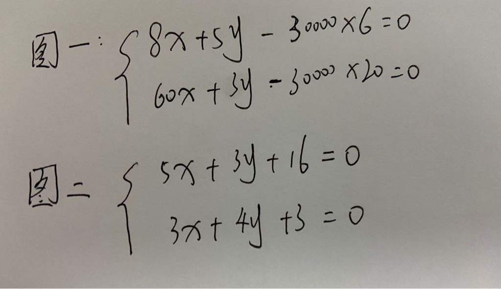 3者加到一起等于0,所以-6*30000-8*p2-5*p3=0,于是30000*6+8p2+5p3=0,这是第一个方程,