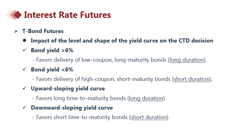 当前市场利率>6%,以折现因子作为标准的话,此时交割债券对应的是“折价债券”【即实际利率算出的债券价格,比6%算出的债券价格,更低】,要使净成本最小,交割债券最好久期越大,这样的话,当利率上升,债券价格下降的越快,净成本越小。即当收益率>6%时,选久期较大的债券。