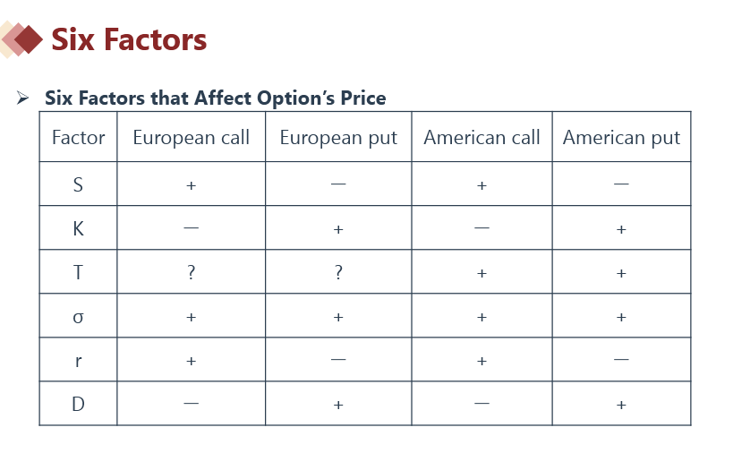 老师好,请问有欧式看涨看跌,美式看涨看跌的价格影响因素总结表格嘛?