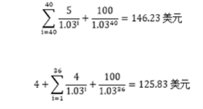 ,假定某债券的息票率为8%,债券期限为18年零4个月。为了计算转换因子,假定债券的期限为18年零3个月。将所有息票支付的现金流以年率(半年复利一次)贴现到3个月后的时间上,债券价格为:图第二个公式