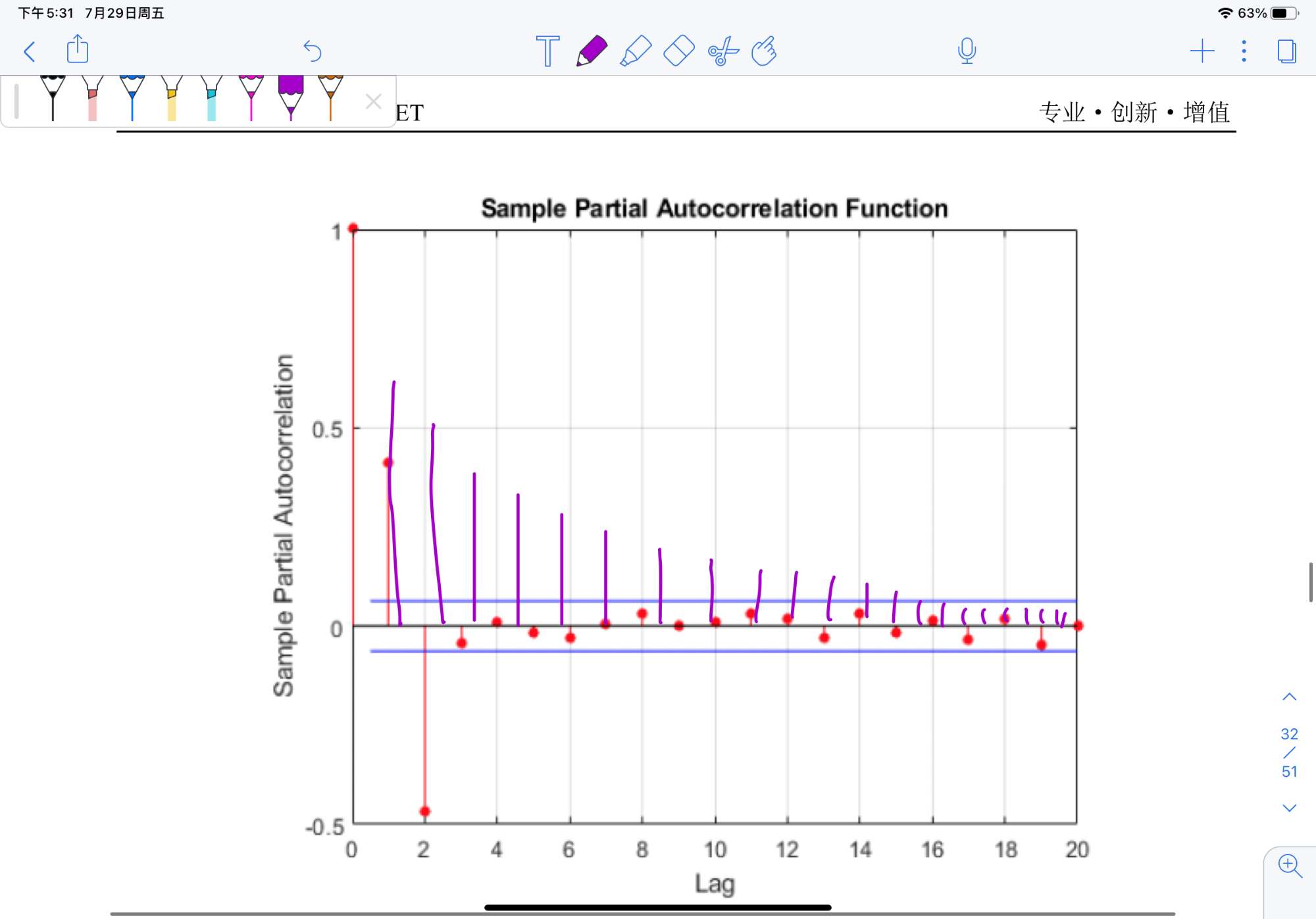 从AR(1)模型中还可以看出模型的偏自相关函数只与滞后一阶的Yt-1有关,而与其他滞后阶数的数值无关,因此当滞后阶数超过1时,AR(1)模型的偏自相关函数将会瞬间减小到0,也因此AR(1)模型的偏自相关函数呈现“截尾”(cut off)特征。AR(2)滞后超过1,且图片可以看到出现了截尾。