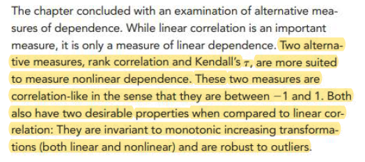 同学,你好,两种替代性测量方法,即等级相关和Kendall´T,更适用于来衡量非线性依赖性。这两种测量方法是相关性,因为它们都在-1和1之间。与线性相关相比,也有两个理想的优点。它们对单调增长的变换是不变的(包括线性和非线性),并且对离群值有很强的稳定性。