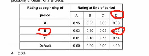 这个0.02就表示,期初评级为B的债券,1年末违约的概率是0.02