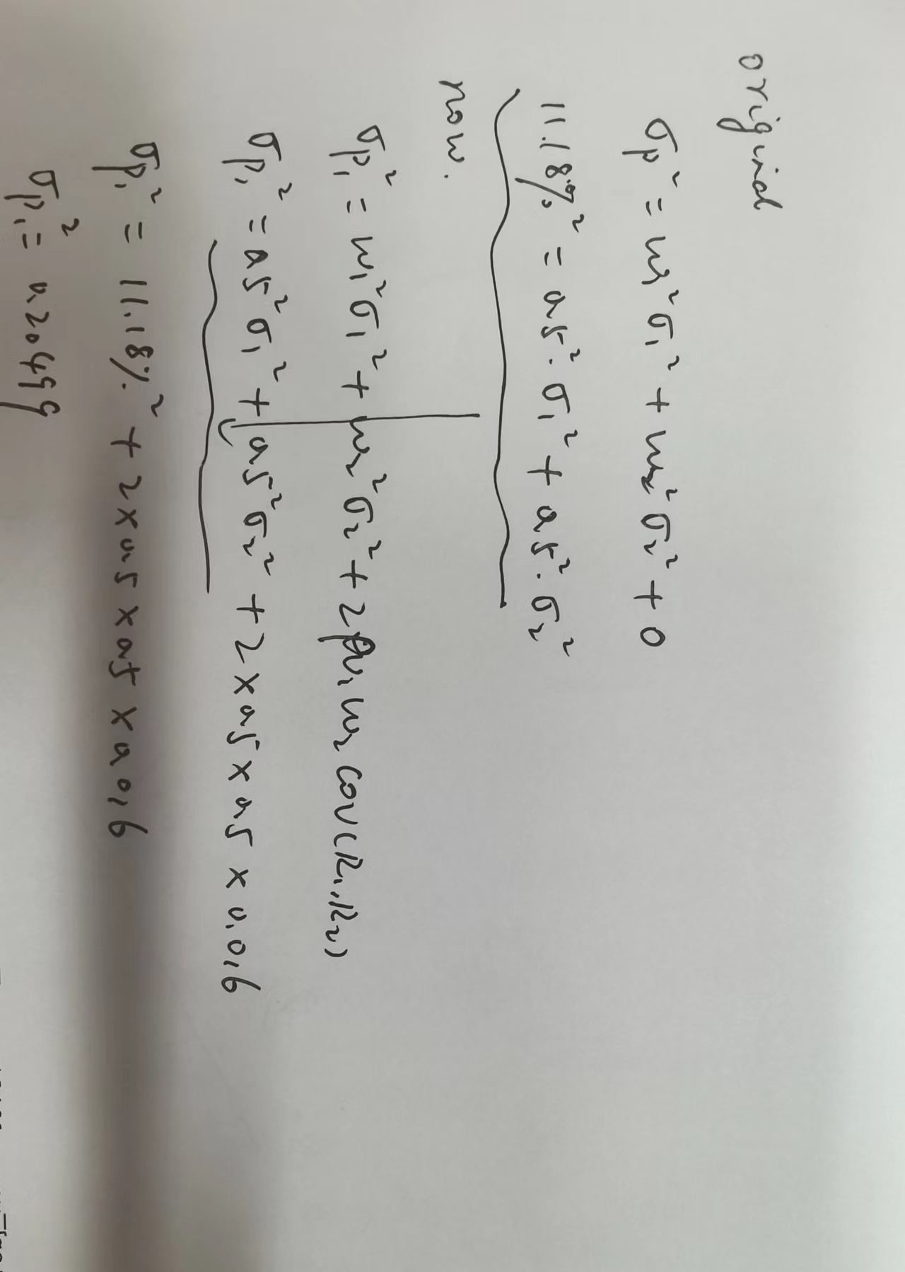 现在,组合内部资产之间的协方差变成了0.016,其他条件不变,新的组合方差计算公式仍然可以写出来,这样一来,两个方差公式写完以后,就只剩下1个未知数,就是新的组合方差,求出新的组合方差以后,减去原先的组合方差,就是题目要我们算的了