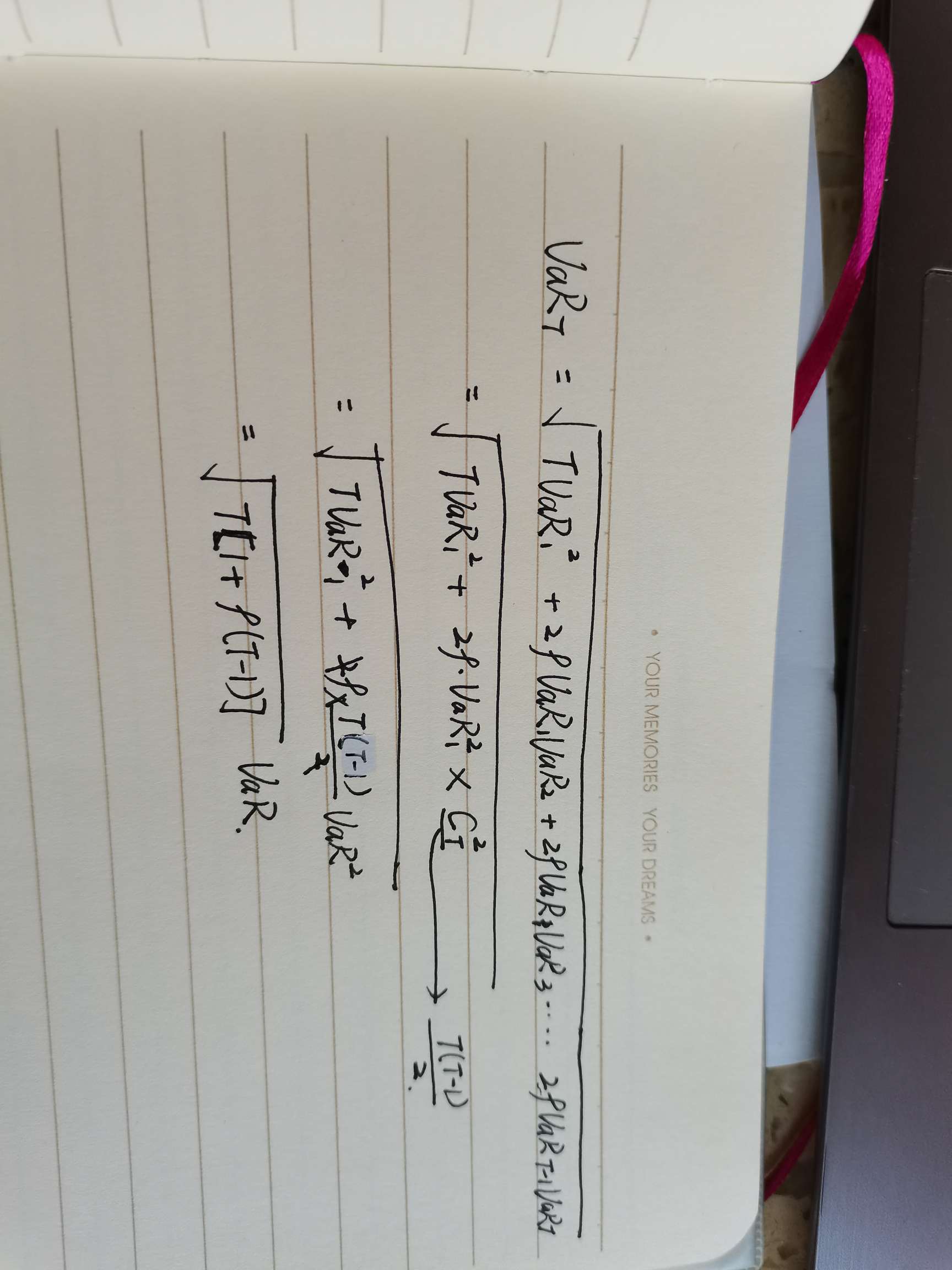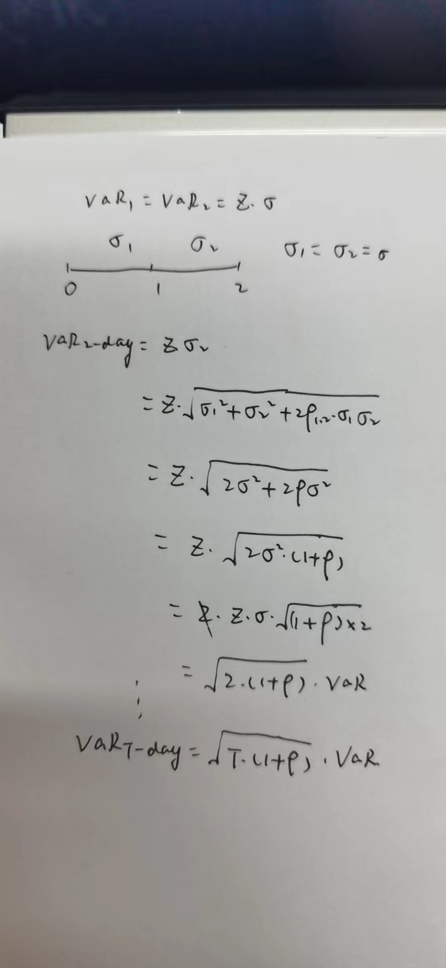 老师好,请问在将VAR有一天推到T天的时候,如果彼此之间相关系数等于ρ,VaR相等,上课讲了个公式VaR(T)=VaR*根号下(T*(1+ρ)),但是我推出来不是这个,能不能展示一下推导过程我看看