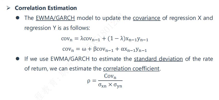 同学你好,计算协方差和相关系数的话,讲义上有现成的公式的,计算n天的cov,等于lmaba乘以n-1天的cov,加上(1-lmaba)乘以X和Y过去一天的收益率