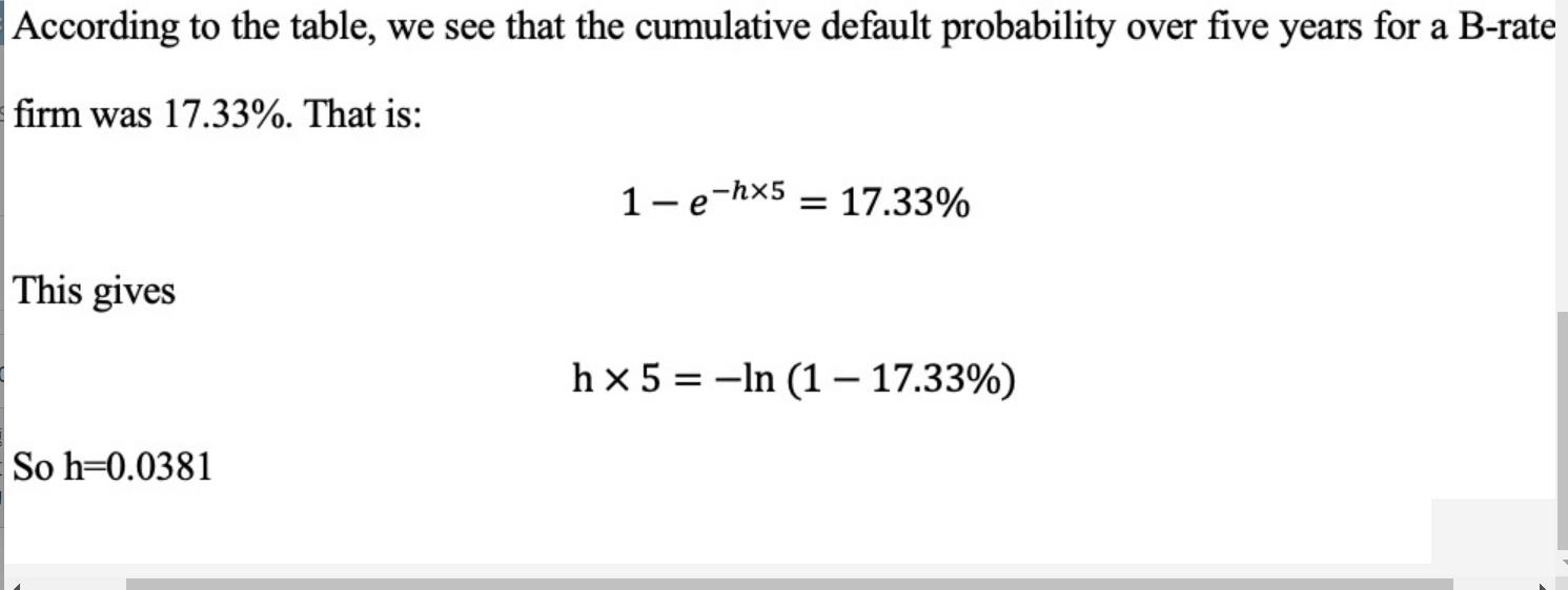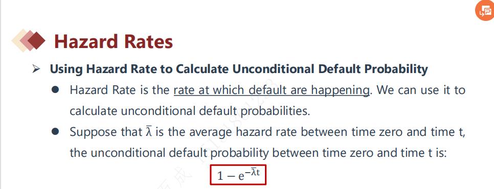 同学你好,hazard rate是一个风险率的概念,本身代表的是一个平均的违约概率,当我们知道了hazard rate以后,可以利用这个参数计算一段时间内的culminative rate,