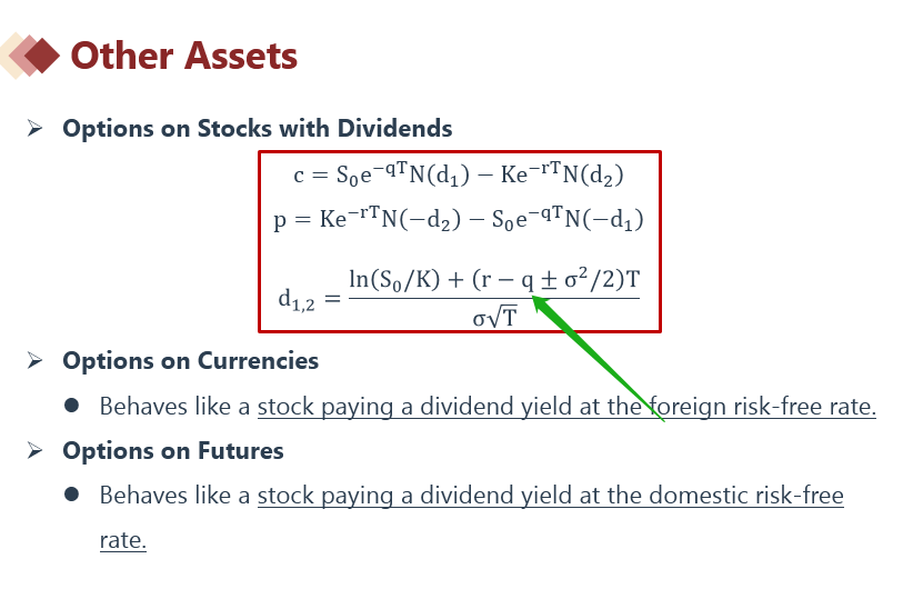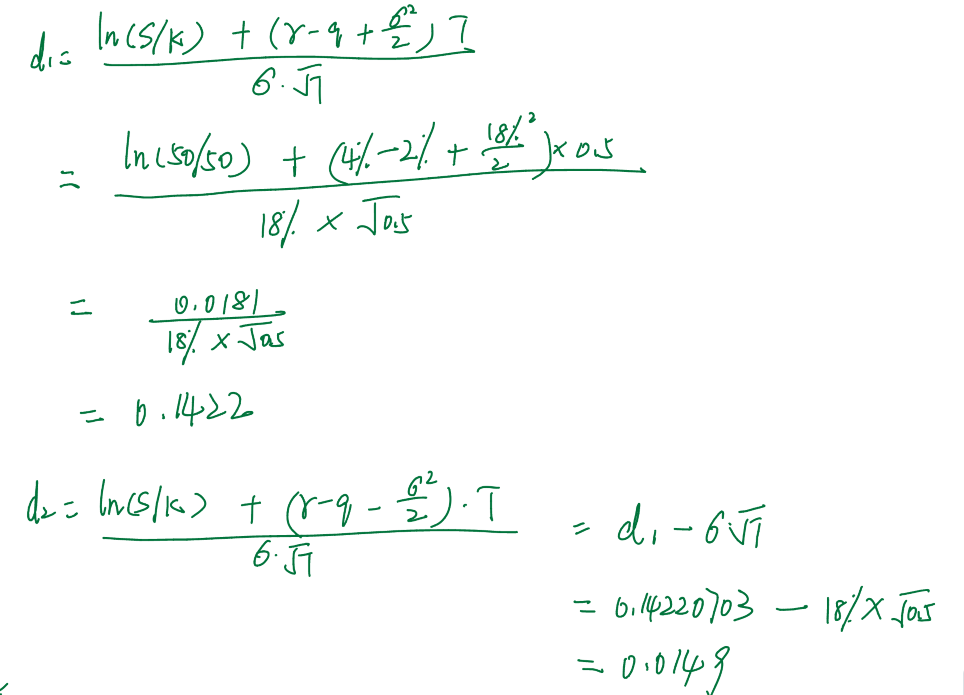 同学你好,如下图,你的d1、d2计算错了。有红利的时候,d1、d2里也是有q的。