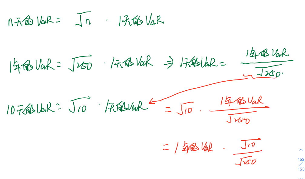老师VaR(1-yr)=根号下250 VaR(1-day)这个公式没错吧?那10天转化为年化的VaR值不应该是10/根号下250 吗?为啥是根号10