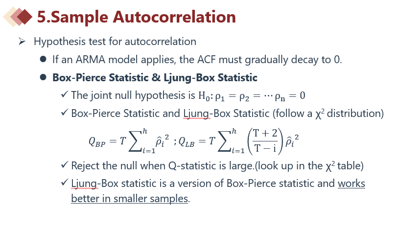 1、一般来说,Box-Pierce Q(BPQ)检验统计量和Ljung-Box Q(LBQ)是几乎相等的,区别在于Ljung-Box Q统计量的样本自相关系数平方和是加权的,当样本容量T足够大的时候,这个权重其实就会趋近于1,所以LBQ与BPQ这两组统计量几乎没有区别。