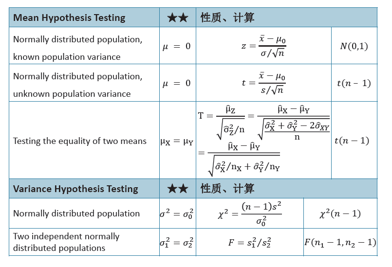 同学,你好,这是数量分析假设检验那一章的内容,其中前两个公式考得比较多,后面的考得少。前面三个公式针对的是在均值条件下的假设,后面两个是针对于方差的假设检验。