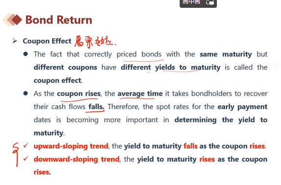 同学,你好,这是息票效应,YTM可以看做是即期利率的加权平均,权重就是每笔现金流对应的权重。Coupon rate就是用来计算每笔现金流的,coupon rate 越高,现金流权重越高。YTM更靠近期初的利率(因为YTM可以看做是即期利率的加权平均,权重就是每笔现金流对应的权重)。如果利率倾斜向上,YTM靠近期初就会小;如果利率倾斜向下,YTM靠近期初就会变大。如果即期利率平,则YTM=Spot rate。