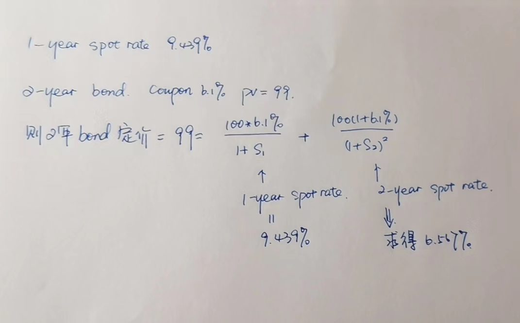 其实第二年运用的是两年期债券的定价公式,通过第一年即期利率和两年即期利率来计算。详见附图。