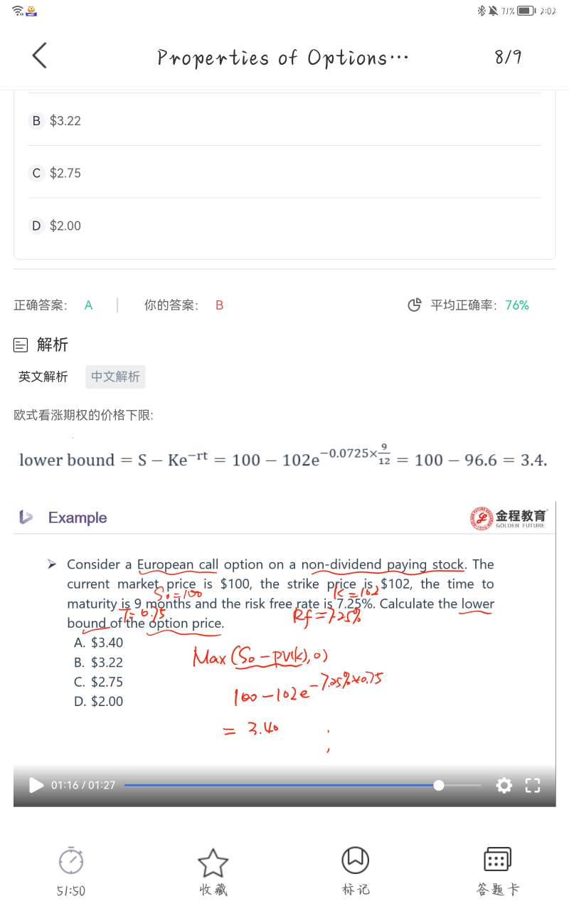一般如果题目有假设复利方式的话按题目假设计算,如果没有假设的话,按照惯例和原版书特点,债券、远期、期货、互换用一般复利,期权用连续复利。另外,你这边的计算也存在一些问题,如果是按年复利,那么分母应该是(1+7.25%)^0.75,如果是按季度复利,分母应该是(1+7.25%/4)^(0.75*4)。