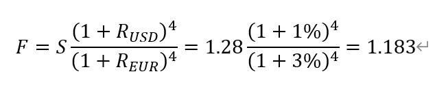 这道题中给的现货报价是1EUR=1.280USD,可以看出是对EUR进行标价,因此可以把EUR看成是标的资产。而标的资产的收益率(需要在计算远期价格时剔除的部分)就是R(EUR)=3%。详细计算过程见附图。