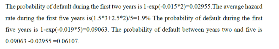 同学,你好,这个计算2-5年的违约概率,就是用前5年的累积违约概率减去前2年的累积违约概率,5年的平均违约概率就是用题目给出的1-3年的违约概率和4-6年的违约概率进行加权平均,带入指数函数计算累计违约概率。