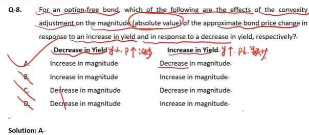 同学,你好,我就是在解释A选项, 凸性的影响就是在利率下降的时候,债券价格上涨越多 在利率上升的时候,债券价格下降越少。