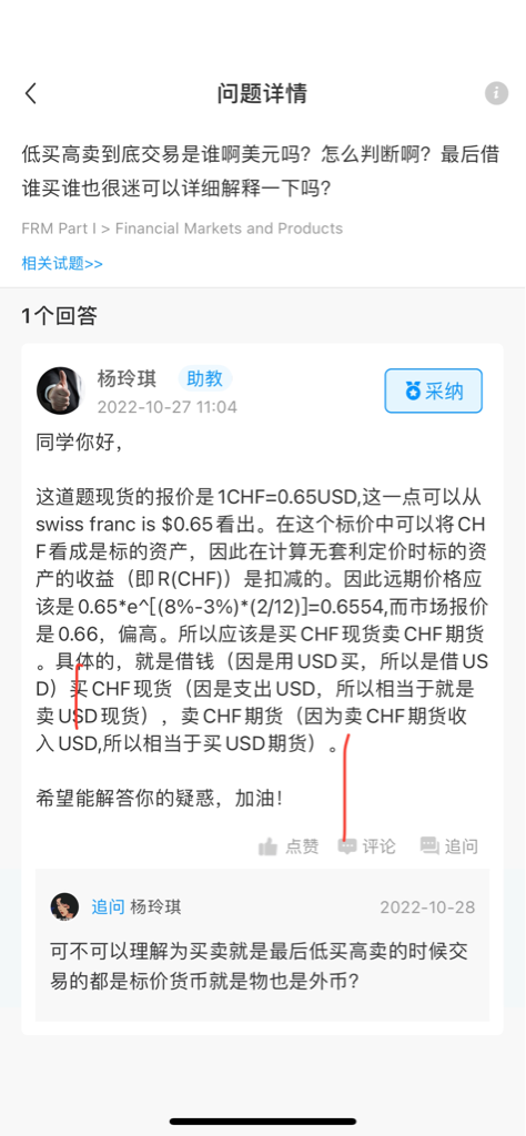 这道题现货的报价是1CHF=0.65USD,这一点可以从swiss franc is $0.65看出。在这个标价中可以将CHF看成是标的资产,因此在计算无套利定价时标的资产的收益(即R(CHF))是扣减的。因此远期价格应该是0.65*e^[(8%-3%)*(2/12)]=0.6554,而市场报价是0.66,偏高。所以应该是买CHF现货卖CHF期货。具体的,就是借钱(因是用USD买,所以是借USD)买CHF现货(因是支出USD,所以相当于就是卖USD现货),卖CHF期货(因为卖CHF期货收入USD,所以相当于买USD期货)。