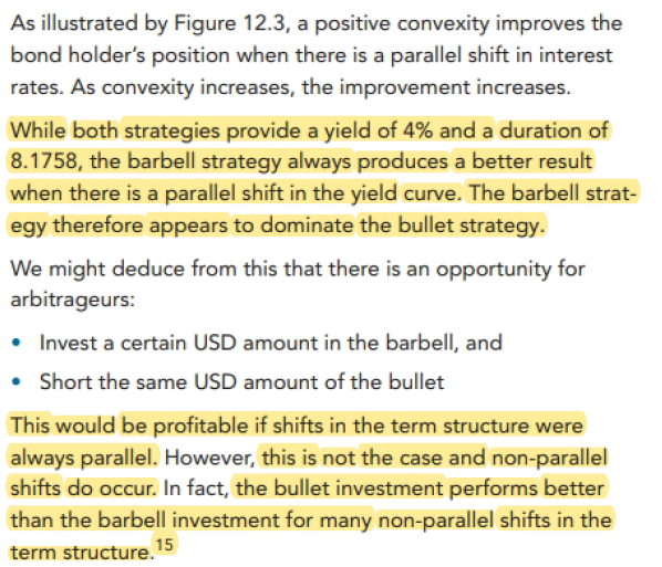 2、平行移动下,如果变化幅度很大,是barbell表现更好,因为凸性更大,利率下降,价格上涨多;利率上升,价格下跌少。
