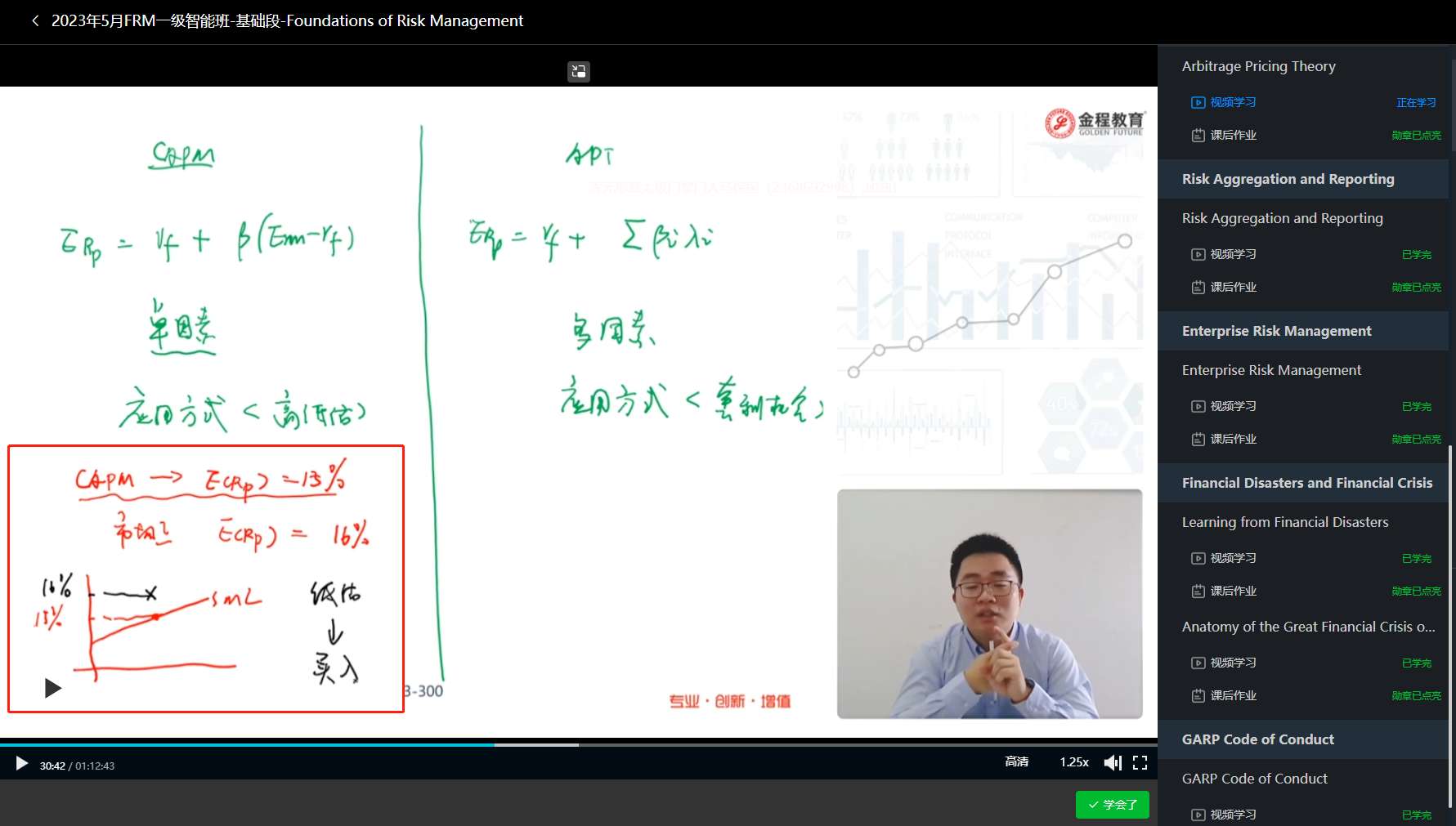我是从29分50秒开始看的。你说的风险越高收益越高是对的。我前面说反向关系(不是反比)的时候没有明确是在相同风险水平的情况下,可能让你误解成以不同风险水平作为前提了。这里老师的CAPM模型以及APT套利都是指在相同风险水平的情况下。老师在左边的CAPM说了,风险水平相同的情况下,收益率被高估,我们可以认为价格被低估。那么同样对于右边的APT套利,这里的无风险套利老师以两个资产风险水平相同但收益率不同为前提。从风险端来看,两个资产一买一卖风险正好为零。至于收益端,根据CAPM,相同风险水平下收益率低的资产被认为是高估。这样看的话我们不就应该去买入收益率为10%的产品并卖出收益率为9%的产品从而真正实现产品价格上的低买高卖吗?