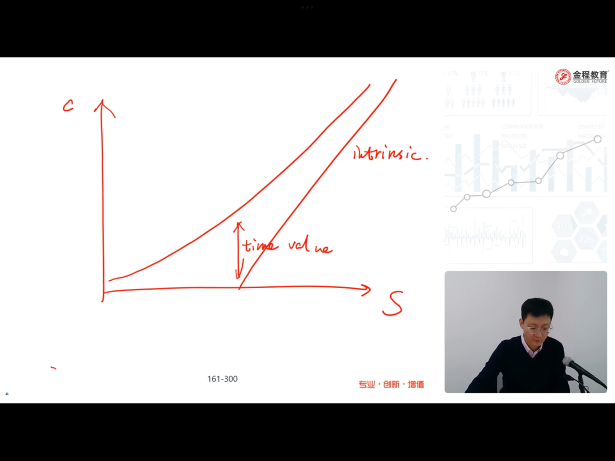 这里面四个图,直线和曲线分别代表什么可以讲一下吗?哪个是time value,哪个是intrinsic-value,中间的差值是什么?