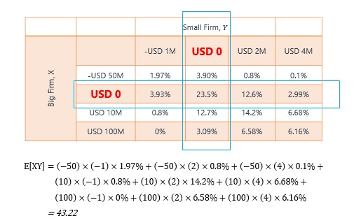 这里,X有4种可能性(-USD 50M、USD 0、USD 10M、USD 100M),Y也有4种可能性(-USD 1M、USD 0、USD 2M、USD 4M)