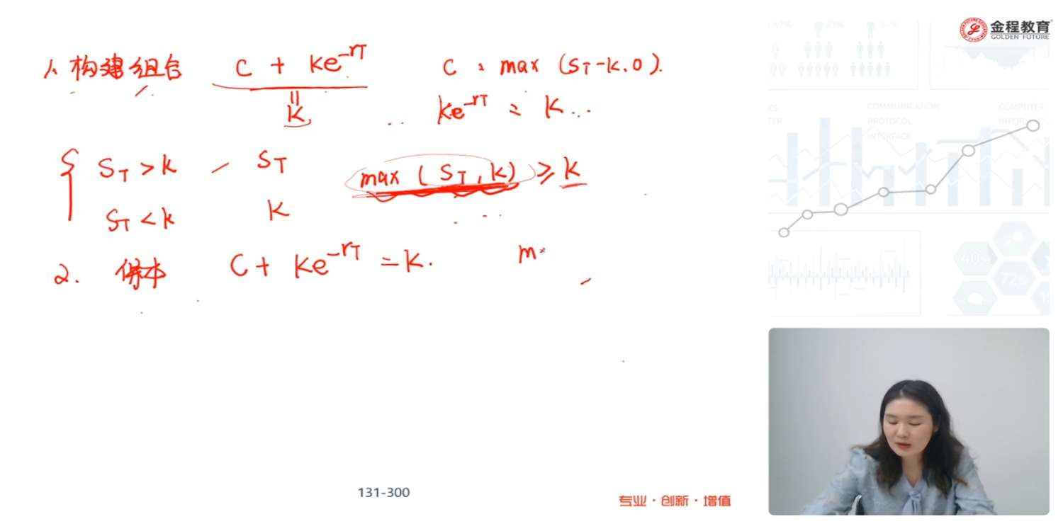 同学你好,这个意思是,我的这个K相当于是一个最大成本了,所以我期初的成本c+Ke^-rt等于这个最大成本,那么到期时候又因为是大于等于K的,也就是我的收益一定能覆盖掉这个最大的成本。连最大的成本都覆盖掉了,所以就是保本了。