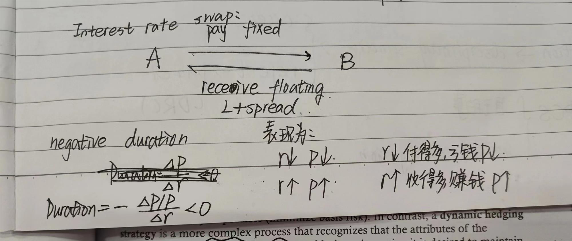 当利率上升时,支固定收浮动,是赚钱的,即价值上升。所以:利率上升,价值上升。这不就是负久期嘛