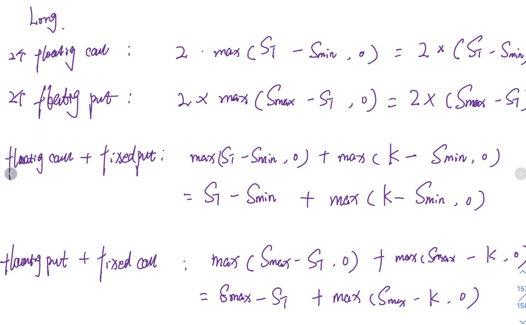 如果是Long position, payoff in 2个 floating call 或者 2个floating put情况会发生吗?如果会,答案是什么? 在short position时,会出现2个 floating call 或者 2个floating put 情况吗? 如果是long position, floating call + fixed put,答案是什么? floating put + fixed call 又是什么? 如果是short position, floating call + fixed put 和floating put + fixed call 分别又是什么啊