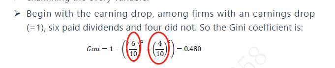 但是亲,你看我给你的截图,如果earings drop是完全不考虑上下游关系,就跟dividend一样的计算思路的话,收益下降的公司是10/20,也就是1/2,而不是老师讲的6/10,事实上课件里老师在算这个基尼系数的时候是先从earings drop=1里面再去看dividend=1的,相当于就是个条件概率,只是条件是earings drop。这个就导致我觉得上下游关系不清楚。