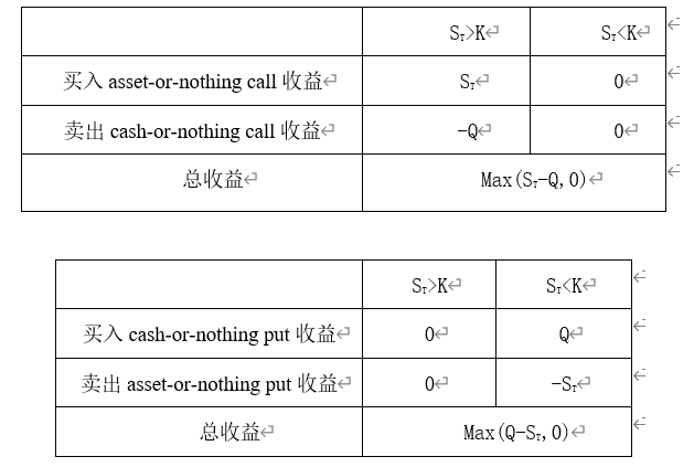 买入资产或空手看涨期权,同时卖出现金或空手看涨期权可以构造出一个普通的看涨期权【即收益和普通的call收益一样】。收益分析如图2上。