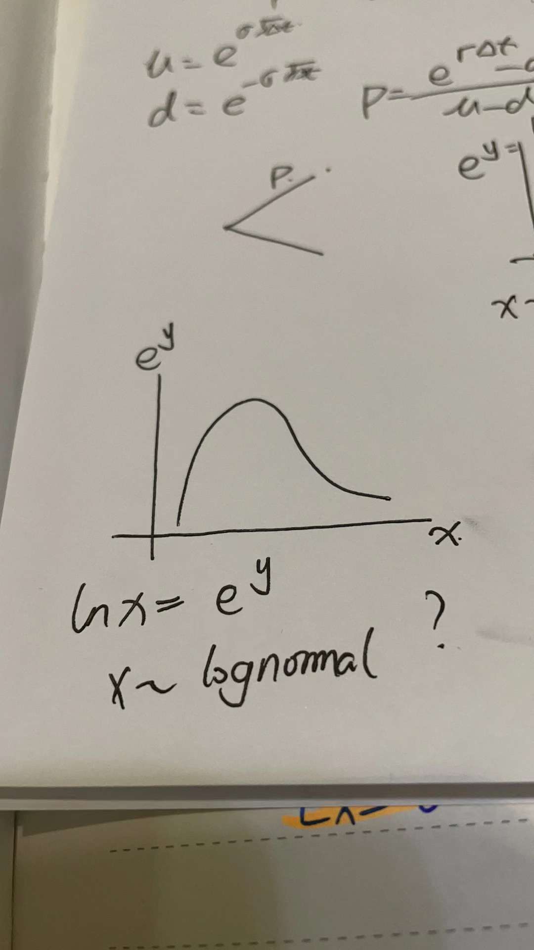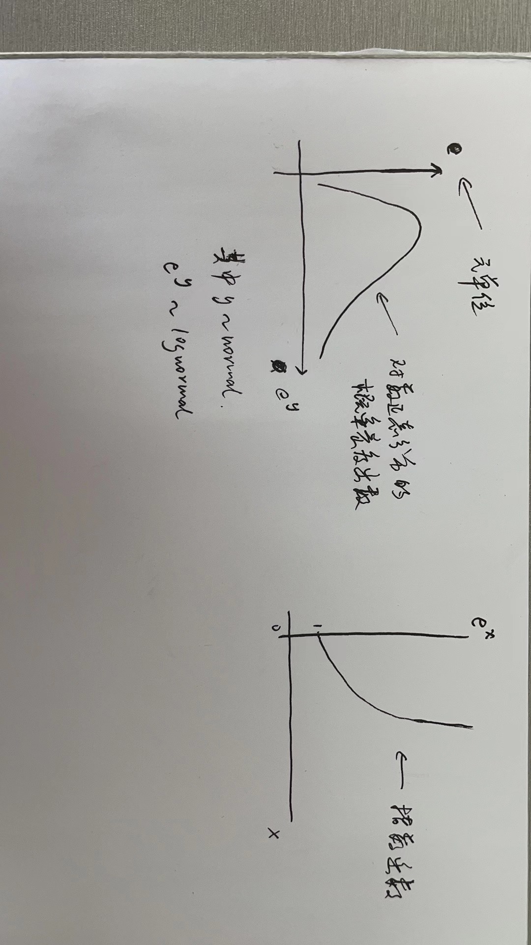 学员你好,EXP以自然常数e为底的指数函数(我画在最左侧的y和e^y),如果说y是一个正态分布(上面的图案),那么e^y就是一个对数正态分布(下面的图案)。
