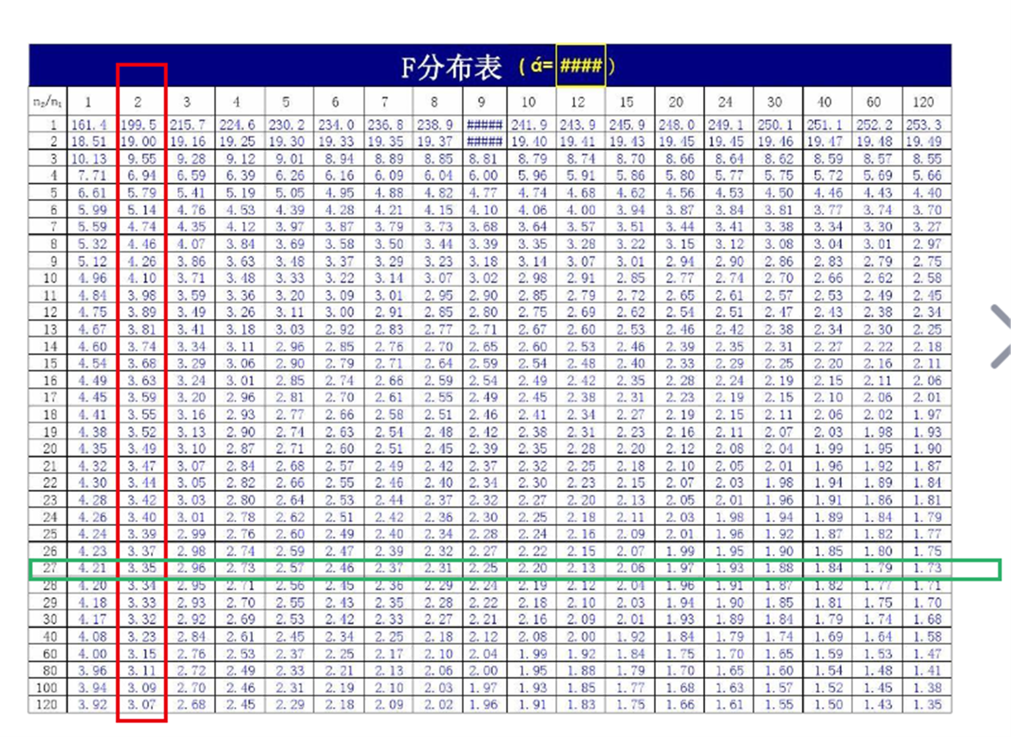 学员你好,f分布表有两个自由度,在回归的F检验中,df1对应的是回归平方和SSE的自由度,也就是k(自变量的个数),df2对应的是残差平方和SSR的自由度,也就是n-k-1。
