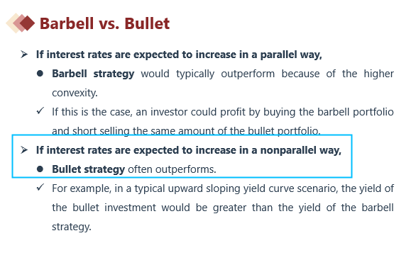同学你好,If interest rates are expected to increase in a nonparallel way, Bullet strategy often outperforms.