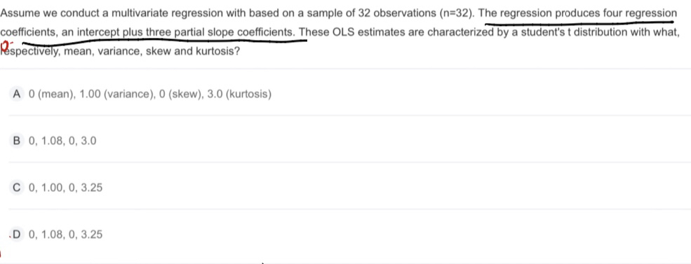 学员你好,这个题目和自由度没有关系呀。他问的是t分布的四个矩,这个不需要计算的,因为t分布的均值为0,偏度为0,这个是最基本的特点,此外低峰肥尾,所以方差大于标准正态分布的方差(也就是1),已经峰度大于3。