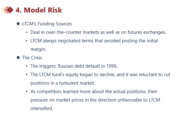 B选项:funding risk是融资风险,LTCM在鼎盛的时期大家都争相把钱想给他,所以不存在融资风险。只有当资产方的期限高于负债方的期限才会出现融资风险