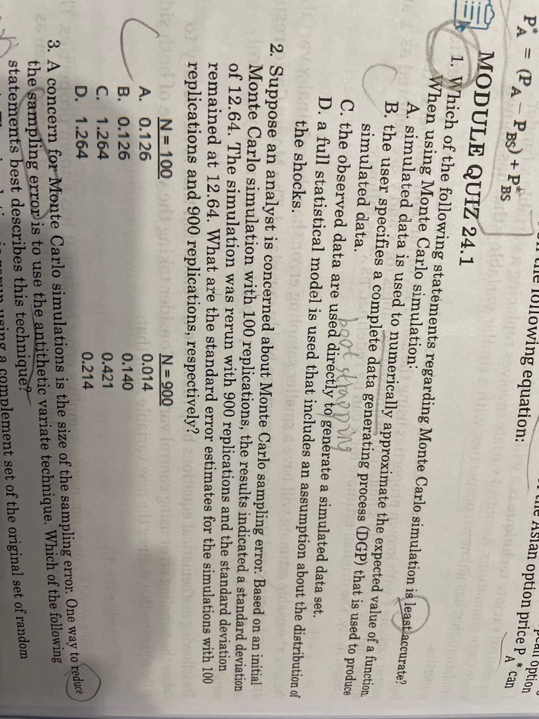 D选项,跟note里课后题1的D选项一模一样,但是note里这个选项是对的,蒙特卡洛模型底层有分布,用于生成模拟数据,但不一定必须是正态分布。不懂为什么在这里就是错的了