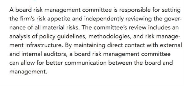 同学你好,A选项更接近于审计委员会的职责。B选项说的就是风险咨询顾问的作用,风险咨询顾问(Risk Advisory Director)是董事会的一员,同时隶属于董事会和风险管理委员会,需要参加风险委员会和审计委员会的会议,不仅要为企业风险管理提出合理建议,同时也要定期与高级管理层沟通。因此风险咨询顾问是董事会与管理层之间沟通的桥梁。而C选项则是Board Risk Management Committee的职责。