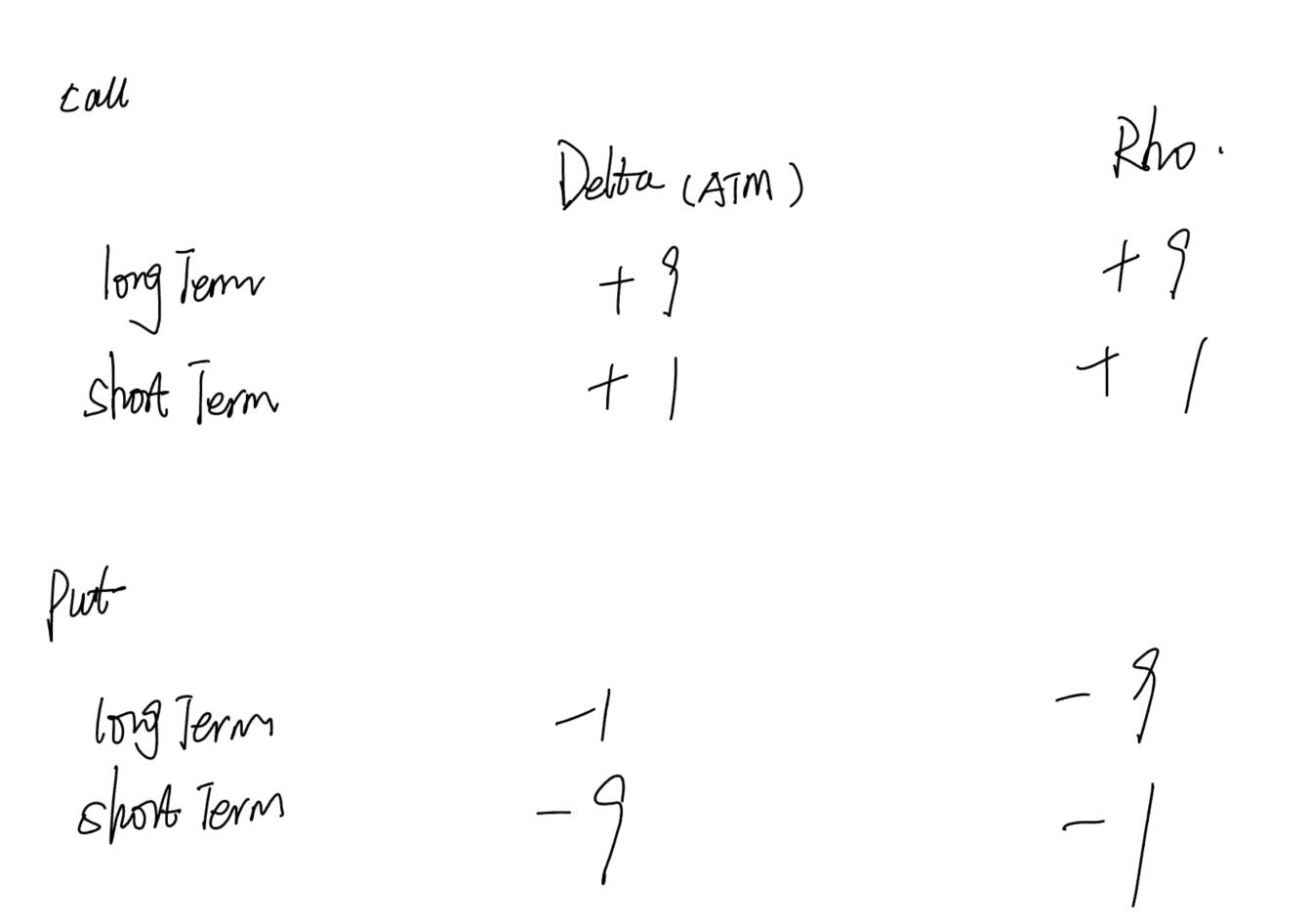 这三个希腊字母的性质已经明白了,请问针对longterm和shortterm,delta和rho的正负号和大小分别是什么样子的?能不能像图片那样,用表格列一下,谢谢!