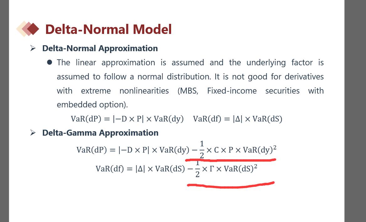 同学你好,如下图:delta-normal法只考虑了一阶导数“delta”。而delta-gamma法同时考虑了一阶、二阶。包含了delta、gamma。所以严格来说,delta gamma法得到的值更加精确。