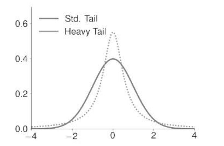 如下图,实线是标准正太,虚线是典型的尖峰肥尾。