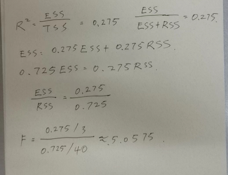 这道题的难点是F统计量不能直接计算,它得需要R^2逆推出来,我把步骤写在图上了,您可以参考一下,只要知道TSS=ESS+RSS就能进行推理。